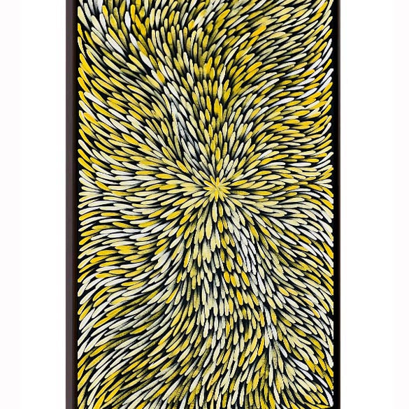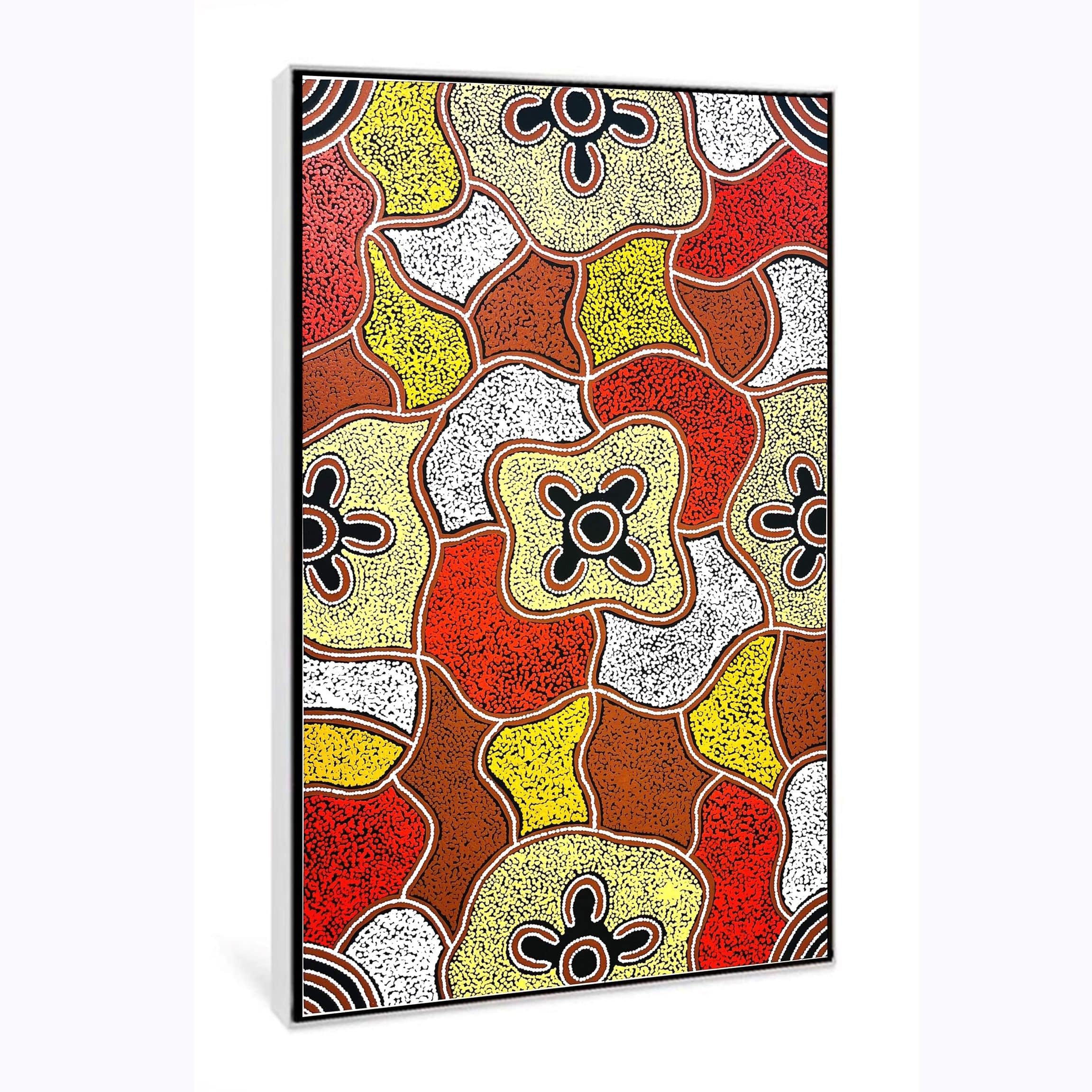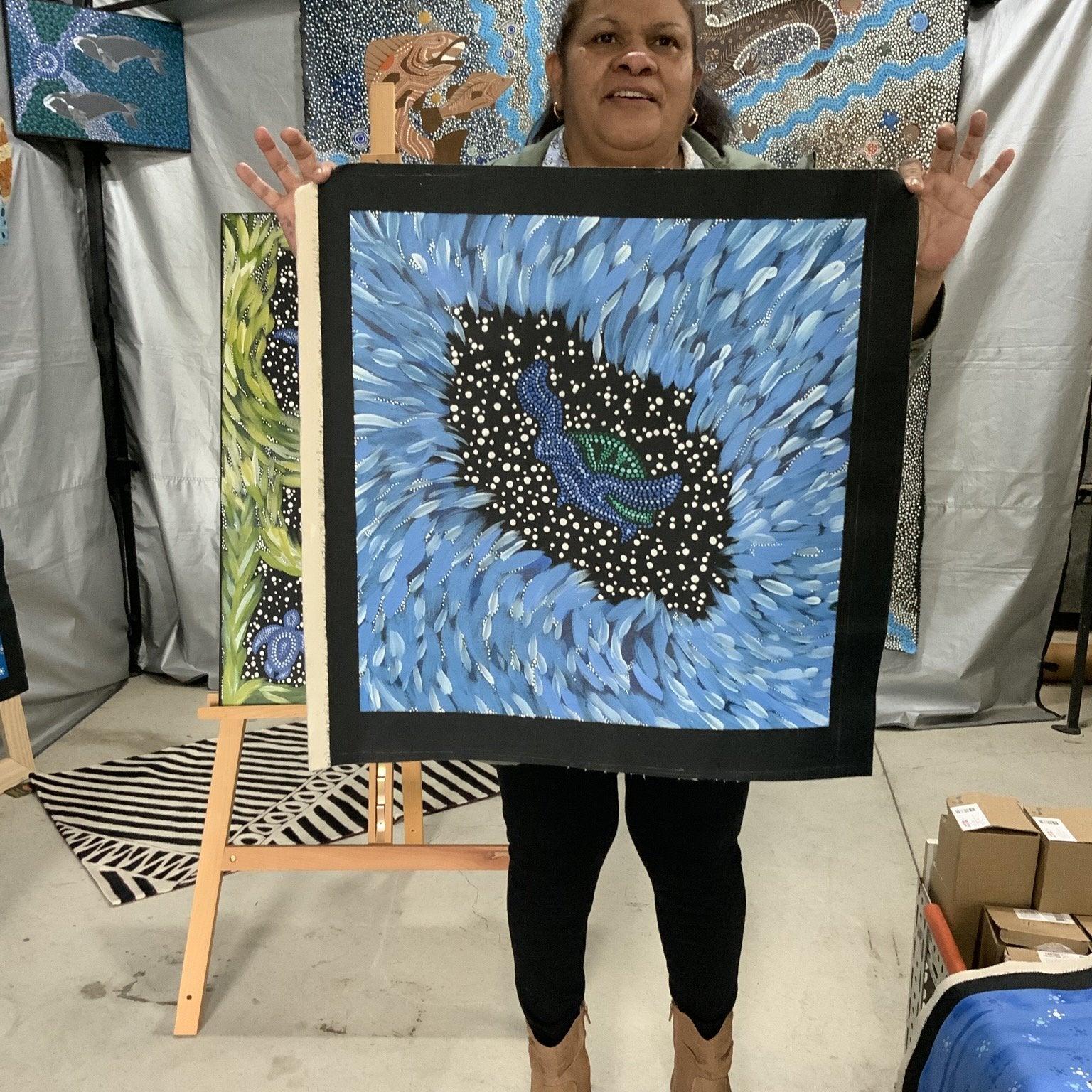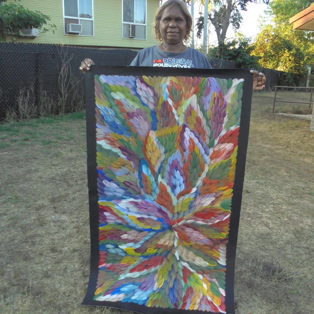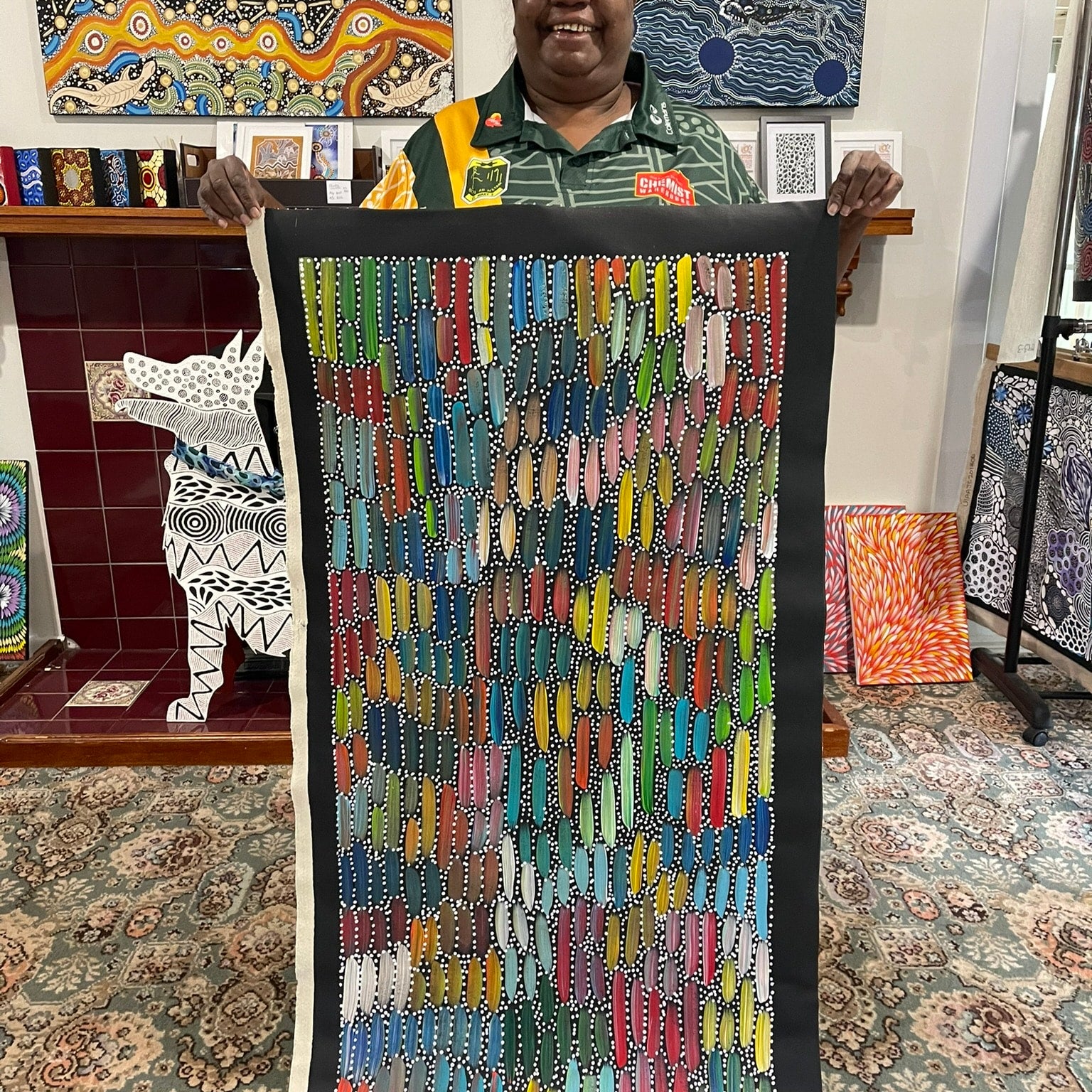 Execution — At Fantastic Framing, our Aboriginal artworks include images of the artist holding their artwork to give you peace of mind.