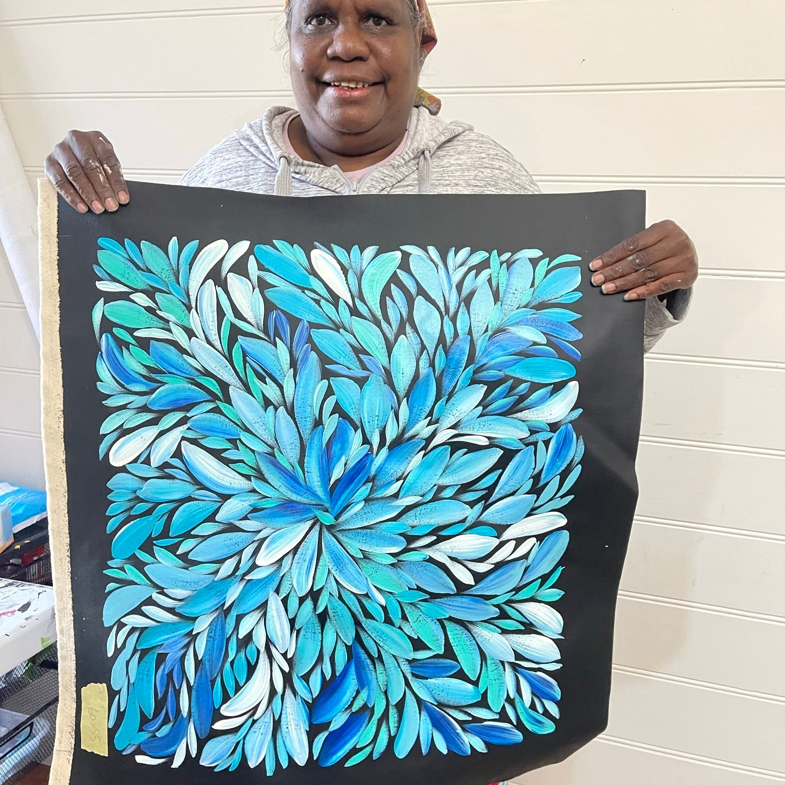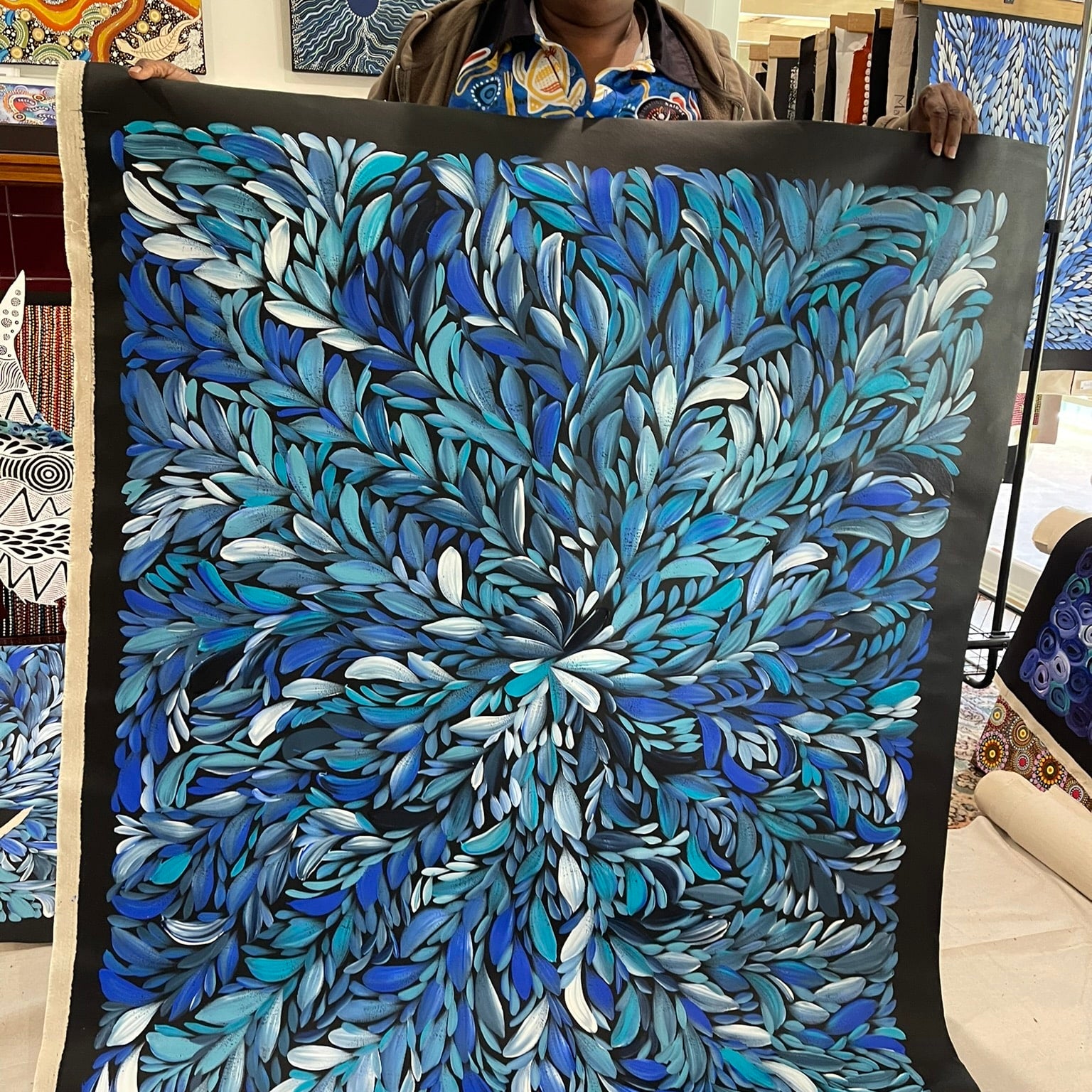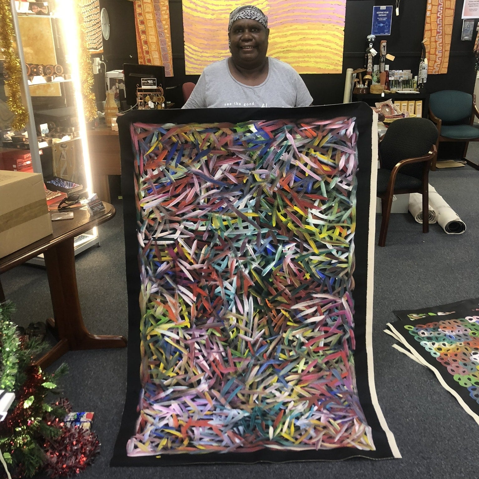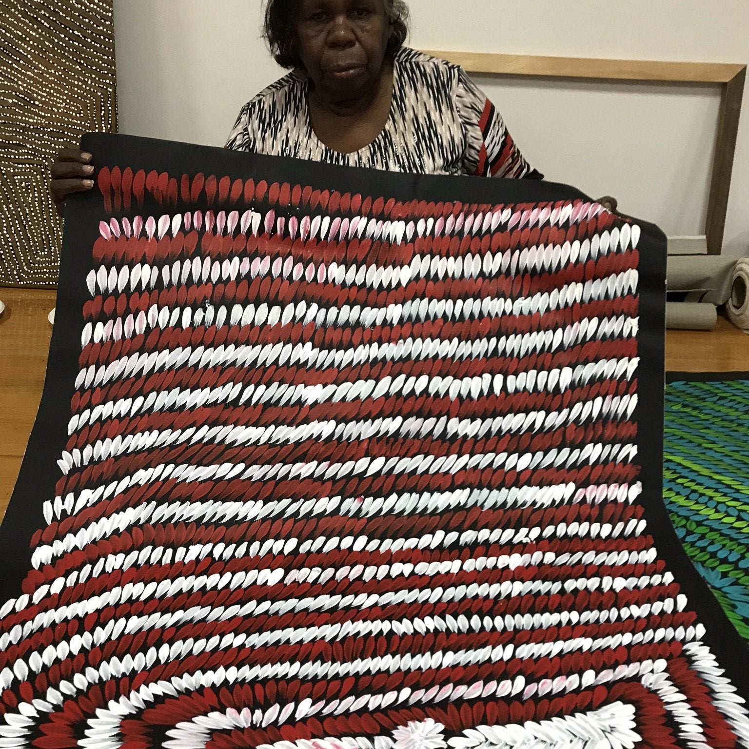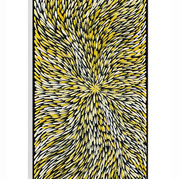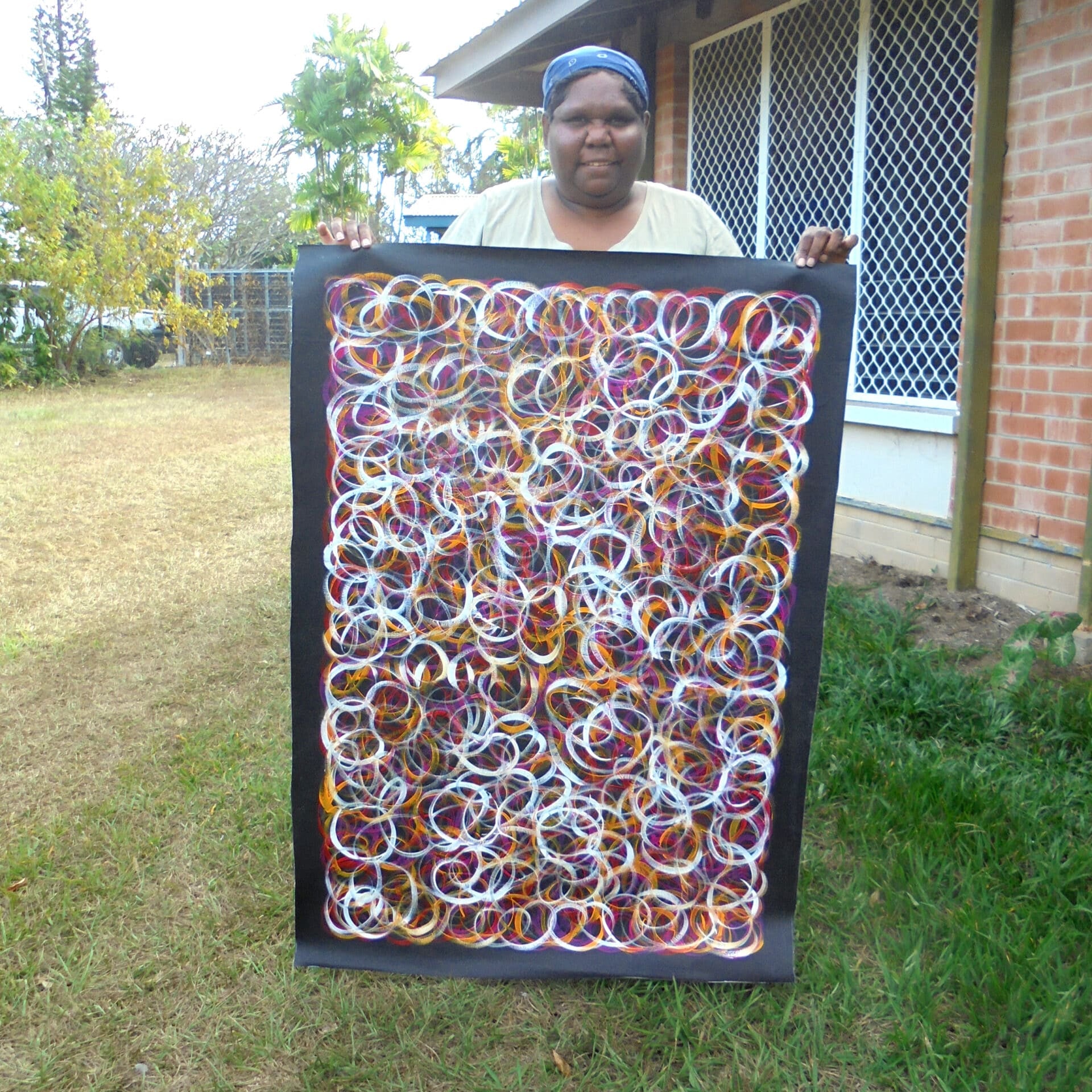 Execution — At Fantastic Framing, our Aboriginal artworks include images of the artist holding their artwork to give you peace of mind.
