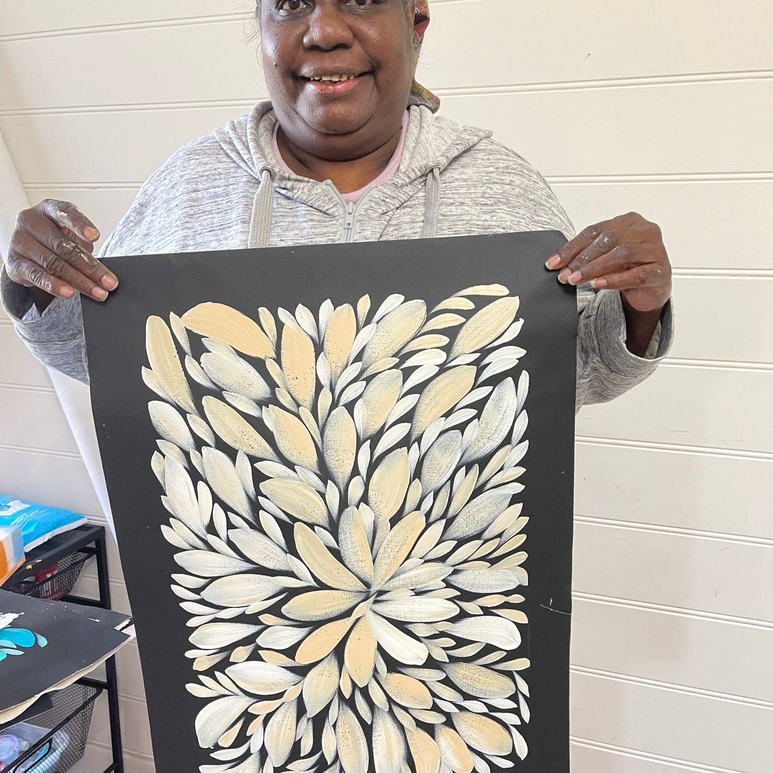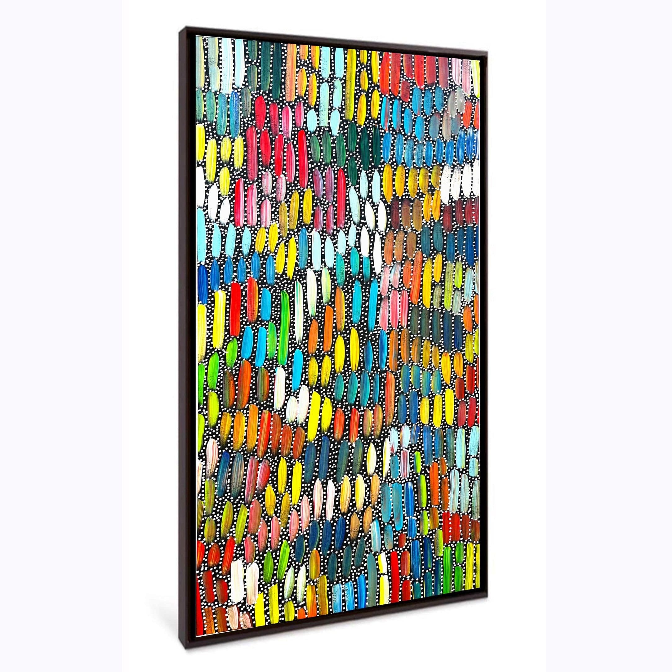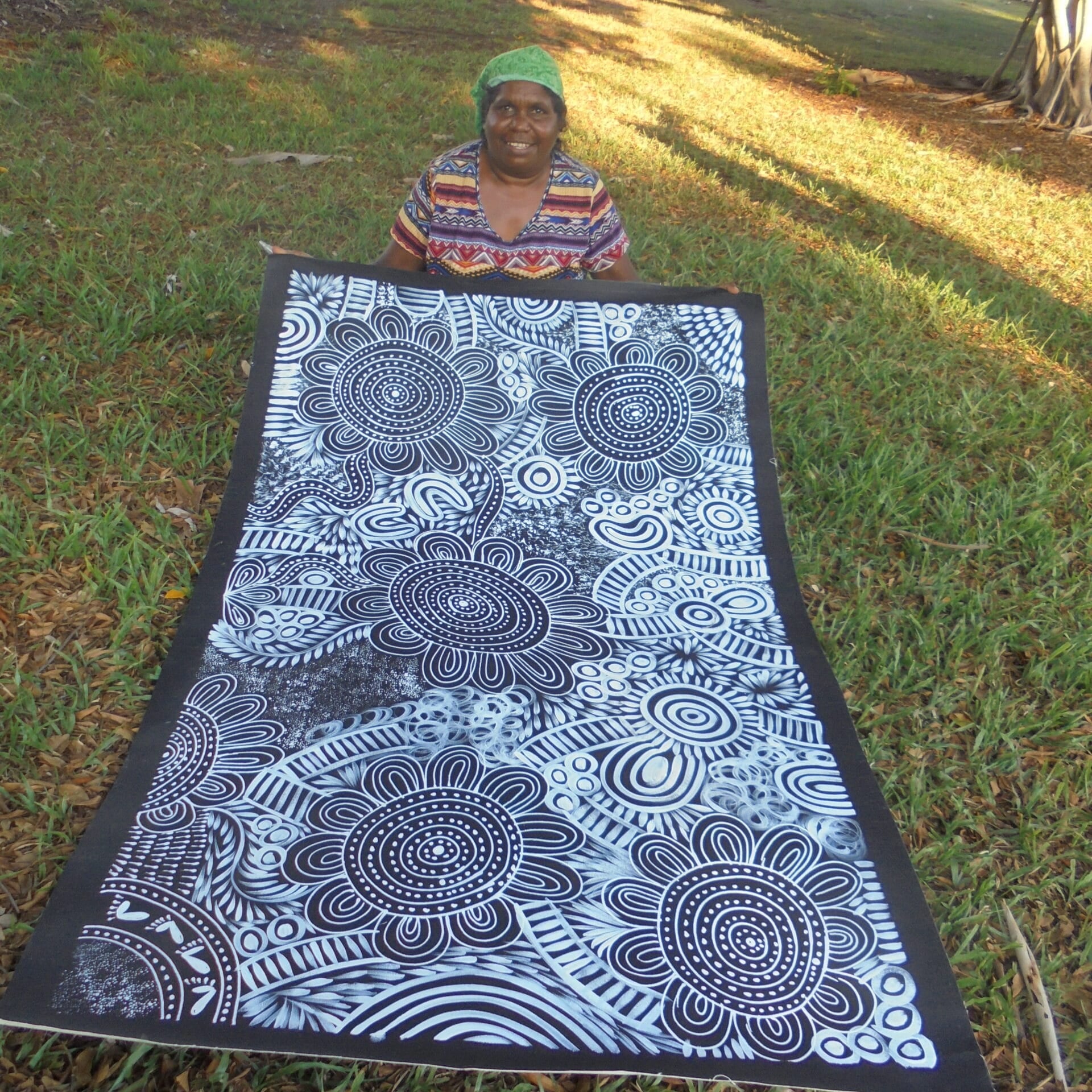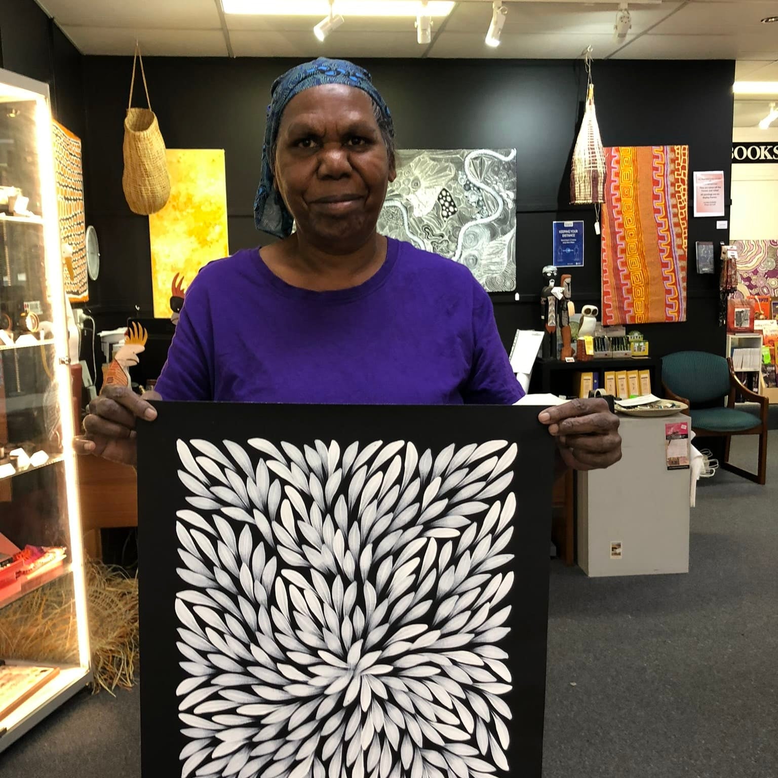 Execution — At Fantastic Framing, our Aboriginal artworks include images of the artist holding their artwork to give you peace of mind.